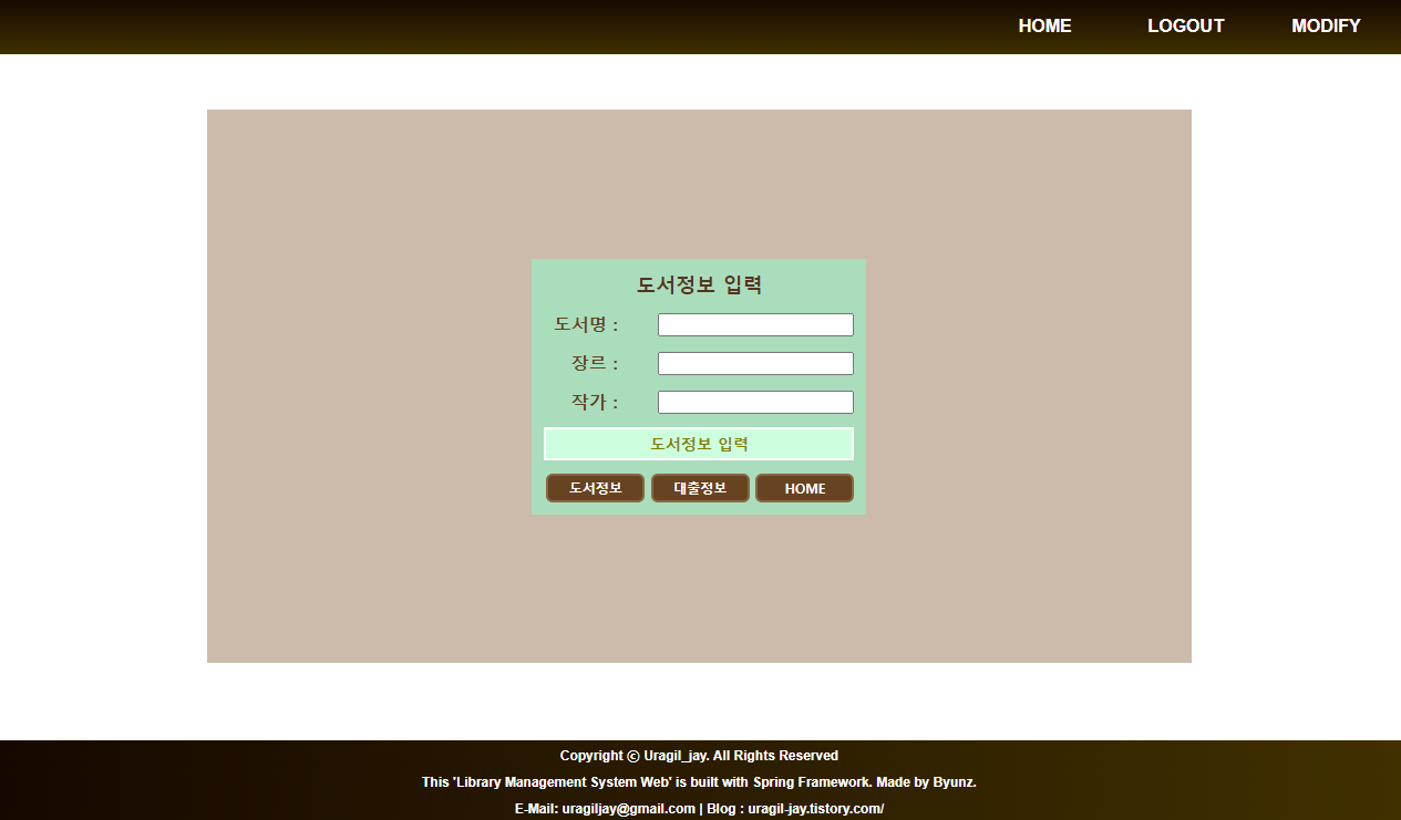 도서정보 입력/ 대출정보 입력/ 회원가입 칼럼만 바꿔서 그대로 이용