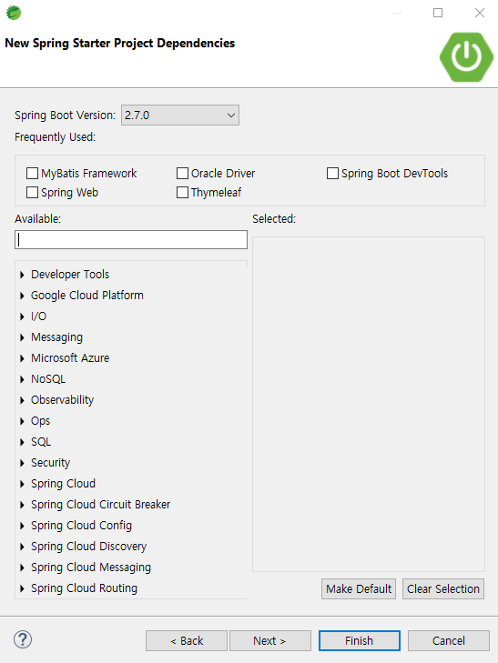 기본으로 사용할 Dependencies 를 선택하는 화면이 나온다.