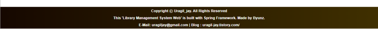 <td class="footer01"align="center">This 'Library Management System Web' is built with Spring Framework. Made by Byunz.